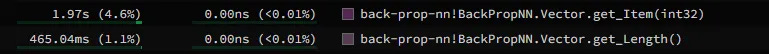 We do a whole bunch of indexing operations, and each one of those ends up doing a bound-check operation. We can eliminate those. We can see this in the profiling stack as Vector.get_Item and Vector.get_Length(). They take approximately just over 5% of the time.