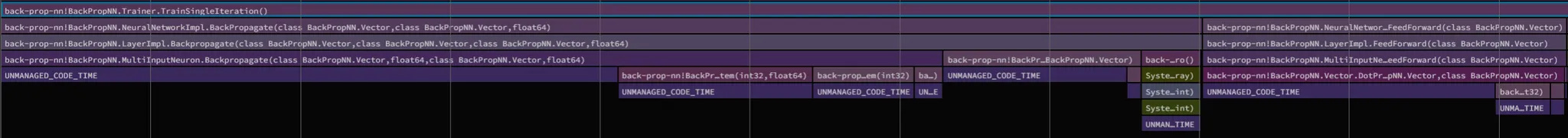 If we dig in a bit further, we can see that SigmoidDerivative doesn’t account for any appreciable time whatsoever so all we’re left with being able to make faster is the multiplication and addition.