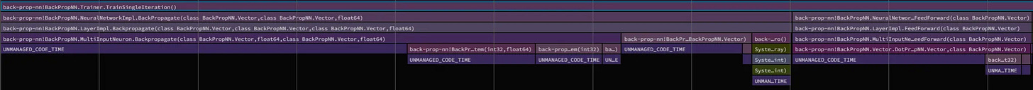 In the default view we can see the lifetime of the program. The TrainSingleIteration is where the most work happens, and if we switch to the “Left Heavy” view we can start to see where the time is spent (I’ll ignore the other bit, since it’s a one-off loading the input from disk).