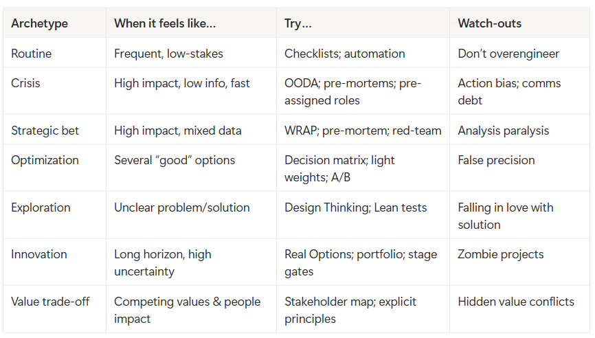 Match – Pick the archetype that best fits that shape (crisis, strategic bet, optimization, exploration, innovation, value trade-off, delegation) and use the tool that matches. Don’t bring a spreadsheet to a firefight, or OODA-loop your way through a strategic bet.