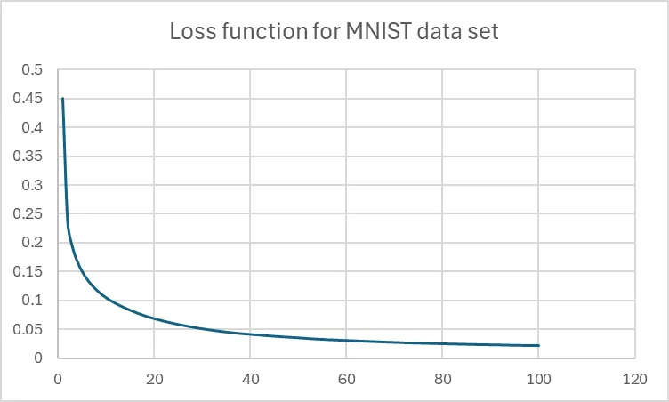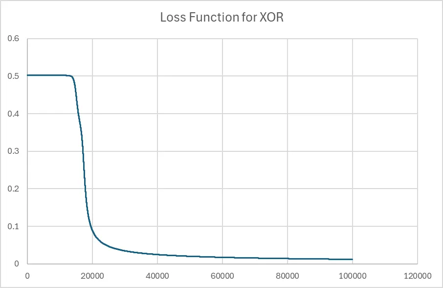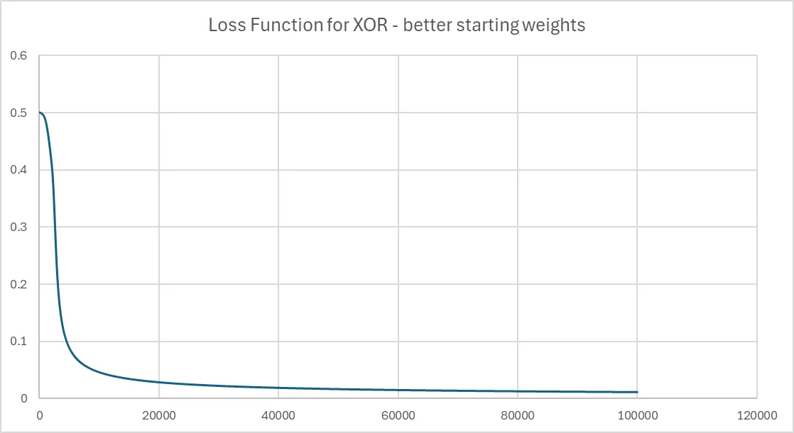 Why the big flat bit at the start? That’s because I picked the initial weights poorly (random numbers between -0.1 and 0.1). We started on a really flat area of the loss function, and it took a long time to navigate across to a valley.