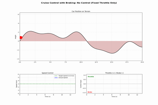 Well, clearly that sucks. As soon as we start going downhill we get out of control, and we risk stopping when going up a hill! How can we fix that? Let’s floor it when we’re going to slow, and slam on the anchors when we’re going too fast.