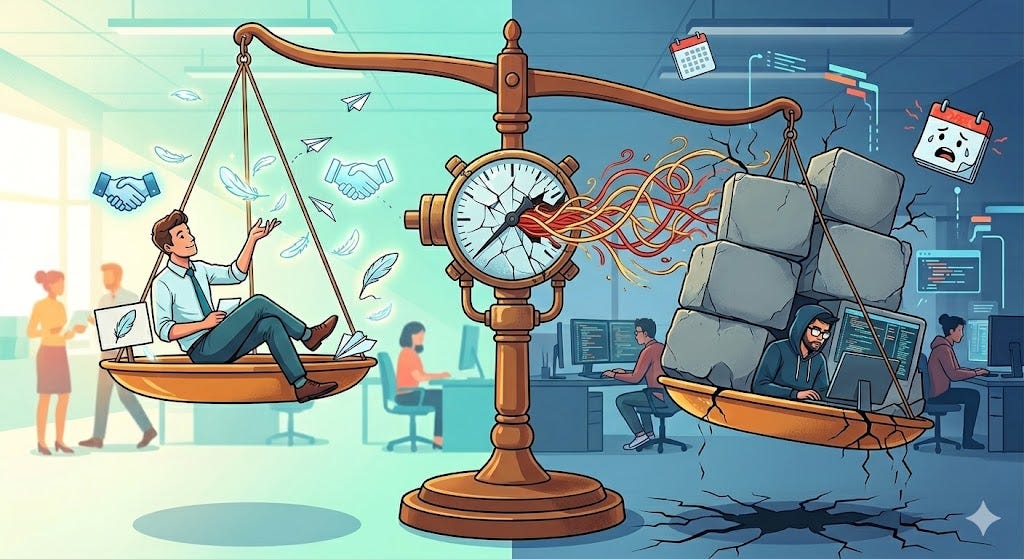 Hey, can I grab 30 minutes of time to chat about the roadmap?”. An innocent, well-meant message, but the recipient now has to context-switch out of the problem they were solving, check their calendar, find a slot, wonder what this is about, and sit in a meeting that could have been three bullet points in a message. Time to write the ask: 8 seconds. Total cost to the company, somewhere between 45 minutes and the rest of the day.